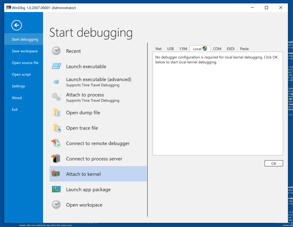 If you are using an old Windows 10 machine, it may launch the old WinDbg. In that case, open an Administrator Command Prompt and execute this command:
