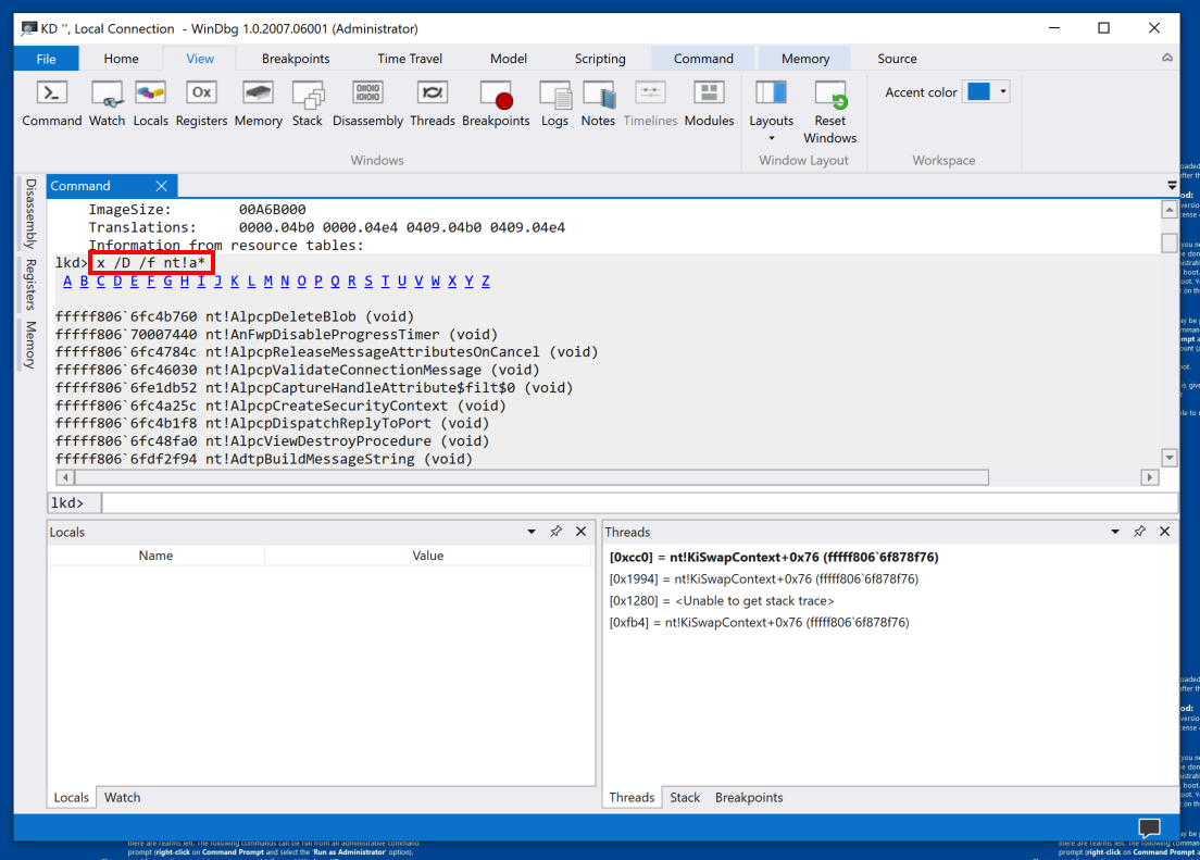 You see the functions starting with "A", including AlpcCreateSecurityContext. Notice the command executed to produce these list of functions in the nt module starting with "A", as shown below.