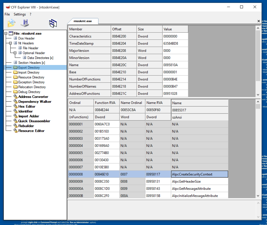 As shown below, there are a lot of functions exported by ntoskrnl.exe, including AlpcCreateSecurityContext.