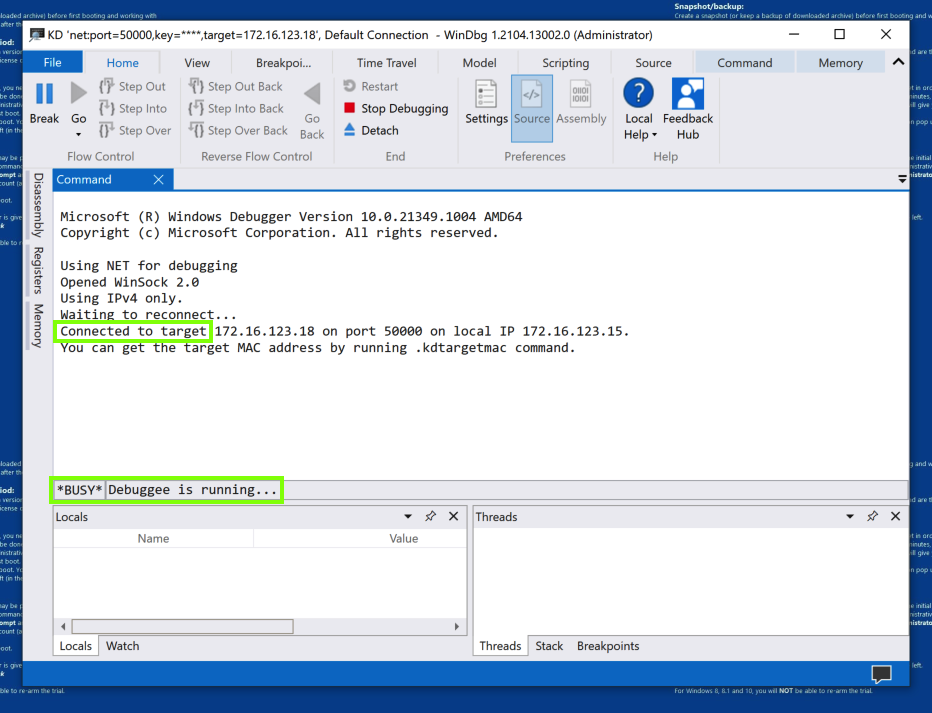 bcdedit /dbgsettings net hostip:10.0.0.4 port:50000 key:flap.jack.dog.frog