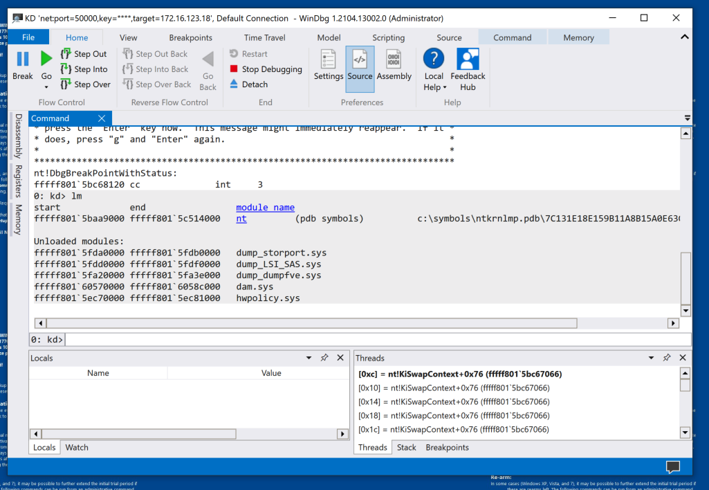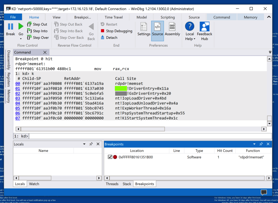The breakpoint is hit.In the lower center of WinDbg, execute this command: