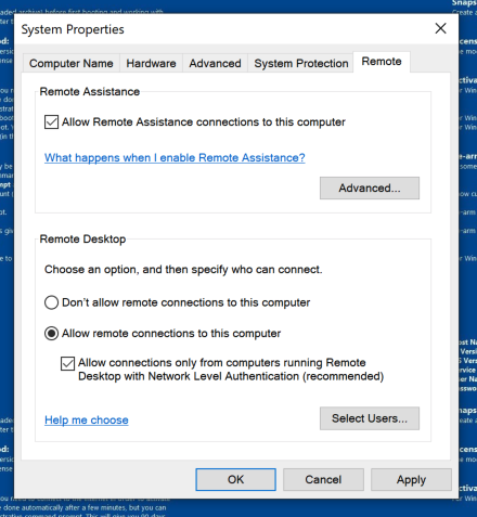 In the System Properties box, click "Allow remote connections to this computer", as shown below.