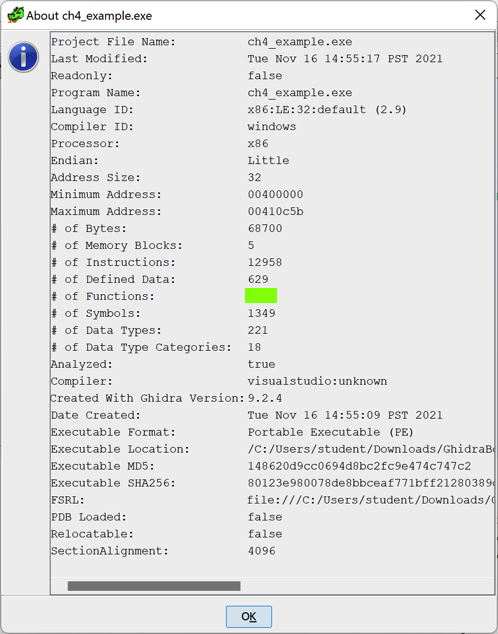 From the Ghidra menu bar, click Help, "About ch4_example.exe".The flag appears, covered by a green box in the image below.