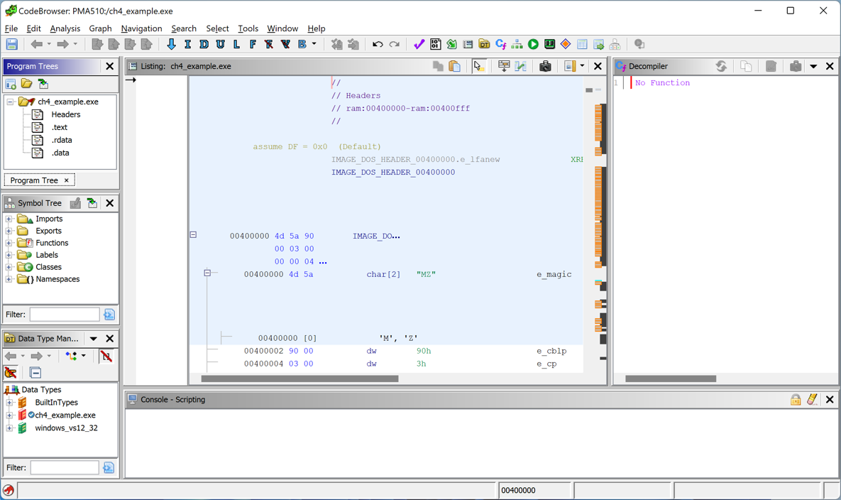 You see a "CodeBrowser" window containing the first few bytes of the file, starting with "MZ", as shown below.