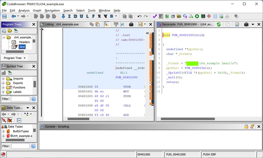 In the CodeBrowser window, in the top left, in the "Program Trees" pane, double-click .textThe pane on the right is titled Decompile and it contains reconstructed C++ code.