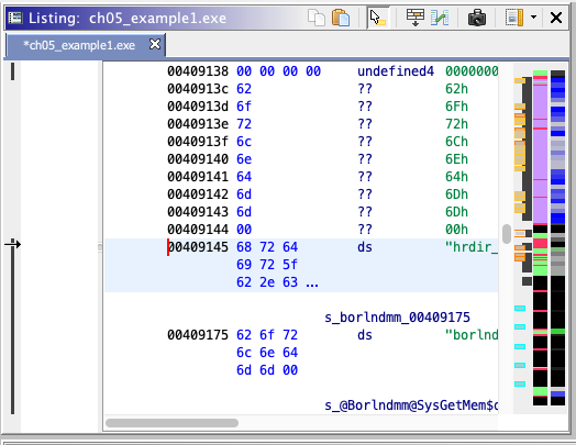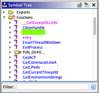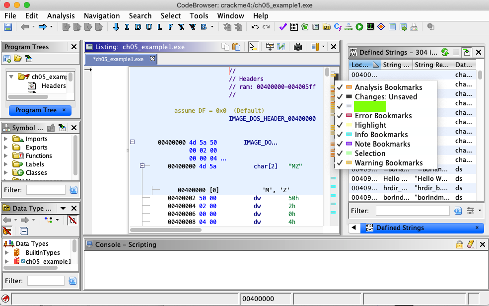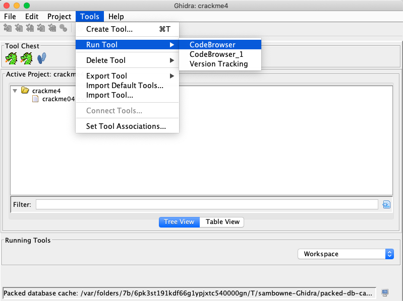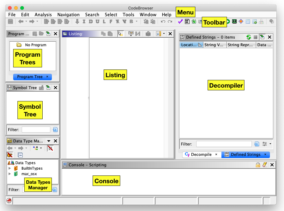 The CodeBrowser window opens. Notice the labelled items in the figure below. There is a Menu bar, a Toolbar, and six windows.