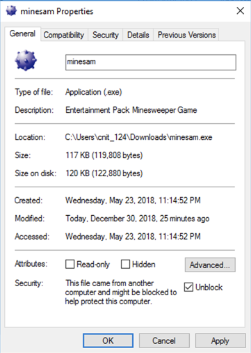 In the Properties sheet, at the bottom, click Unblock, as shown below. Click OK.
