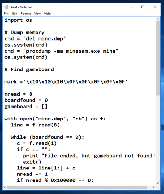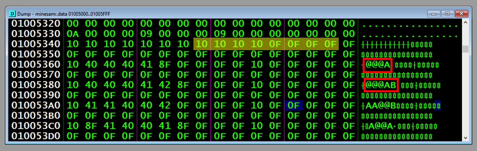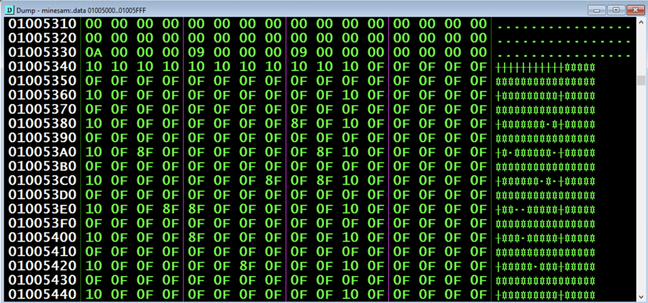 Notice the region of 8 bytes highlighted in light green in the image above. If we can find this sequence of bytes in RAM, we can find the gameboard in a memory dump.