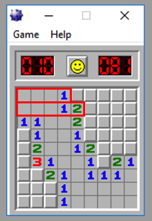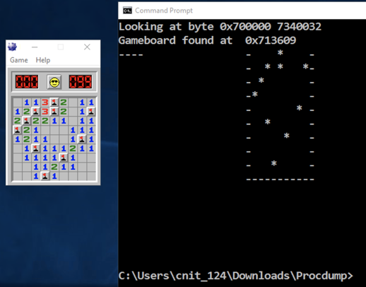 Compare the Minesweeper gameboard with the Dump window, as explained below.
