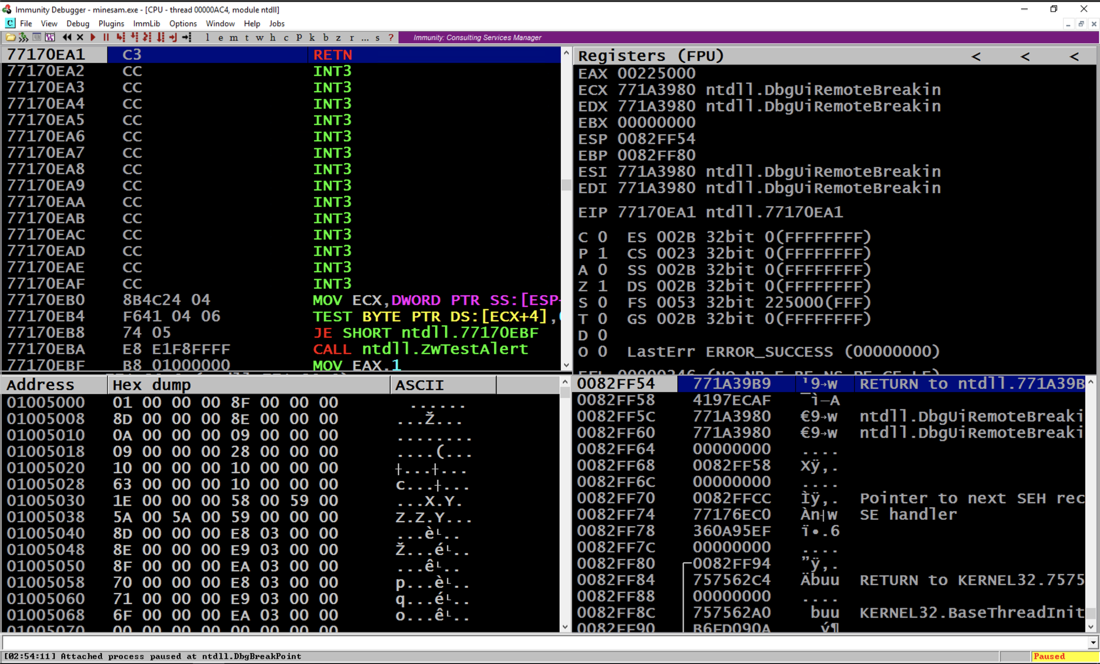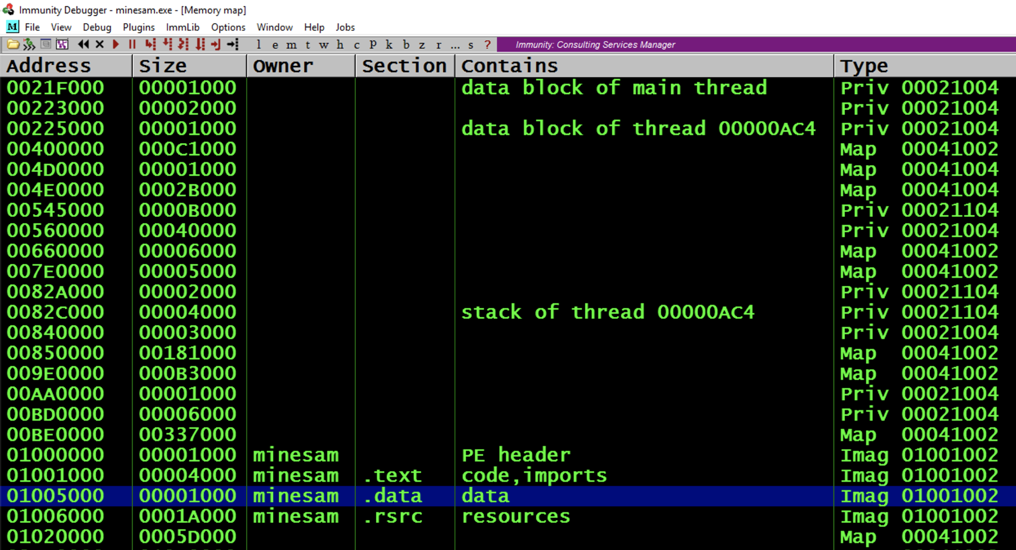 From the Immunity menu bar, click File, Attach. In the "Select process to attach" box, click minesam. Click the Attach button.