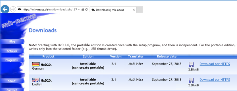 On the Downloads page, in the "English" line, click the "Download per HTTPS" link, as shown below. Save the HDSetup.zip file in your Downloads folder.