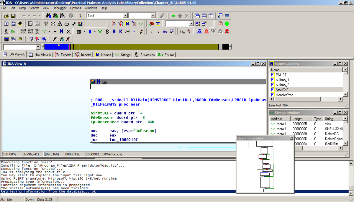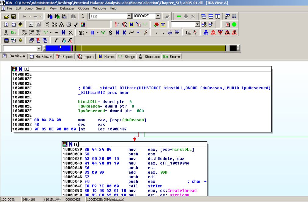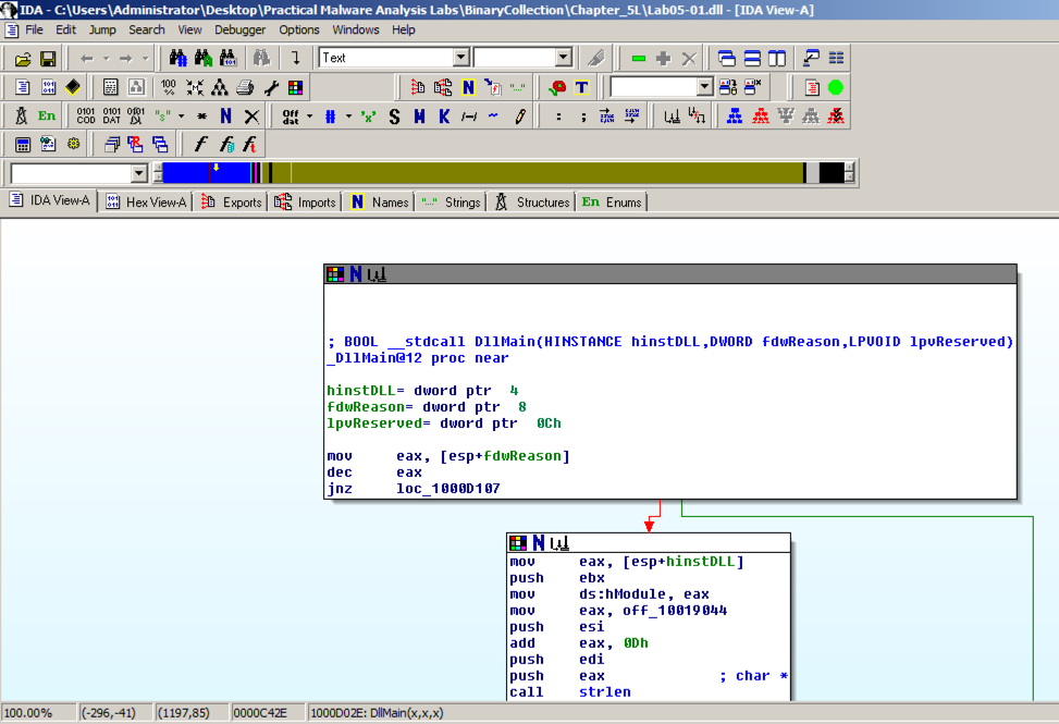 In the "Welcome to the PE Dynamic Library file loading Wizard" box, click Next , Next , Finish .在“欢迎使用PE动态库文件加载向导”框中,单击下一步 , 下一步 , 完成 。 IDA opens the file, as shown below: IDA打开该文件,如下所示: