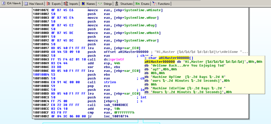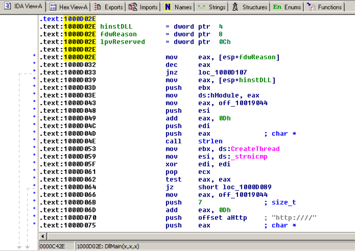There are nine calls to gethostbyname in five different functions.在五个不同的函数中有9个对gethostbyname的调用。 Double-click the third one from the bottom, at an address of 1001656+101 , as highlighted in the image above.双击底部第三个,地址为1001656 + 101 ,如上图所示。