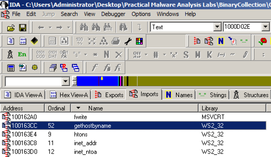 In IDA Pro, click View , " Open subview ", Imports .在IDA Pro中,单击查看 ,“ 打开子视图 ”, 导入 。 Click the Name header to sort by name.点击名称标题按名称排序。 Find "gethostbyname", as shown below.找到“gethostbyname”,如下所示。 (Note that capital letters and lowercase letters sort into separate groups.) (请注意,大写字母和小写字母分为不同的组。)