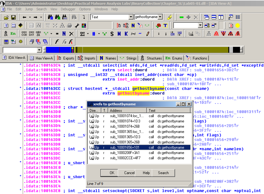 Click gethostbyname .点击gethostbyname 。 Yellow highlights appear on both occurrences of that name, as shown below.黄色突出显示出现在该名称的两次出现中,如下所示。 Press Ctrl+x to open the "xrefs to gethostbyname" box shown below.按下Ctrl + x打开下面显示的“xrefs to gethostbyname”框。