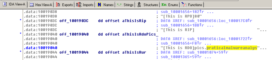 The Text view shows that this location contains a pointer to a string containing "praticalmalwareanalys", as shown below. Text视图显示这个位置包含一个指向包含“praticalmalwareanalys”的字符串的指针,如下所示。