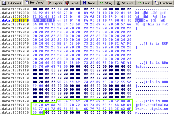 The four bytes starting at 10019040 contain a 32-bit address in little-endian order, as highlighted in blue in the figure below.从10019040开始的四个字节以小端顺序包含一个32位地址,如下图蓝色部分所示。 That address is 10019194. There's a series of ASCII values at that address, outlined in green in the figure below.该地址为10019194.该地址有一系列ASCII值,如下图绿色部分所示。 Skipping the first 13 bytes leaves the string跳过前13个字节会留下字符串