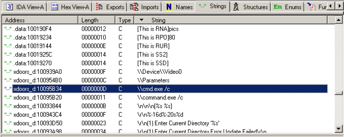 You see the code that uses this string.您会看到使用此字符串的代码。 There are two boxes of code, one that starts a string with "cmd.exe -c" and the other that starts it with "command.exe /c".有两个代码框,一个用“cmd.exe -c”启动一个字符串,另一个用“command.exe / c”启动它。 This looks like a remote shell, executing commands from the botmaster for either a 32-bit or 16-bit system.这看起来像一个远程shell,执行来自botmaster的32位或16位系统的命令。