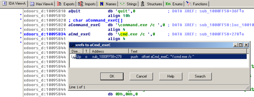 In the "xrefs to aCmd_exeC" box, double-click sub_1000FF58+278 .在“xrefs to aCmd_exeC”框中,双击sub_1000FF58 + 278 。
