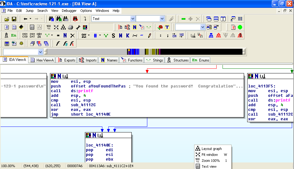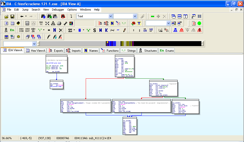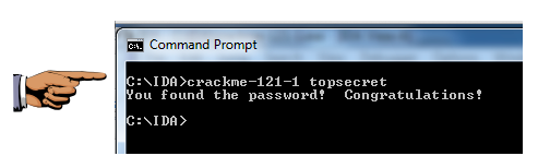 You should see the message "You found the password!", as shown below:您应该看到消息“您找到了密码!”,如下所示: It is very similar to crackme-121-1.这与crackme-121-1非常相似。 Use IDA Pro to find the password, and run the program with the correct password, so you see a "Congratulations" message.使用IDA Pro找到密码,并使用正确的密码运行程序,以便看到“恭喜”消息。