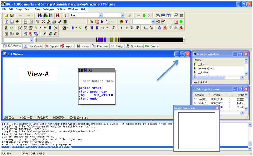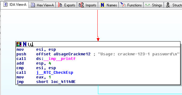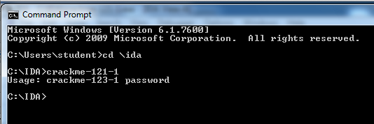 You should see the message "Usage: crackme-121-1 password", as shown below:您应该看到消息“Usage:crackme-121-1 password”,如下所示:cd \IDA