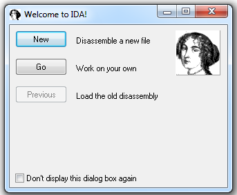 In the "Welcome to IDA!"在“欢迎使用IDA!” box, as shown below, click the New button.框,如下所示,单击新建按钮。