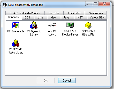 In the "New disassembly database" box, click " PE Executable ", and then click OK , as shown below:在“新的反汇编数据库”框中,单击“ PE可执行文件 ”,然后单击确定 ,如下所示:
