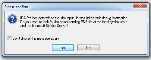 A box pops up saying "...the input file was linked with debug information...", as shown below.一个盒子弹出“...输入文件与调试信息链接...”,如下所示。 Click the Yes button.点击是按钮。