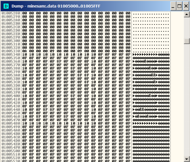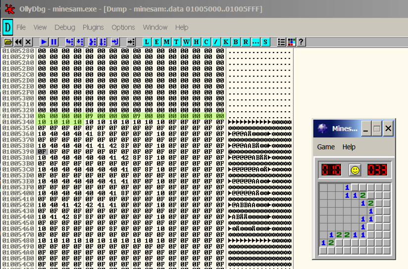 Comare the Minesweeper gameboard with the Dump window. You can see that the gameboard is stored in RAM, using an "A" for "1", and a "B" for "2", as shown below.