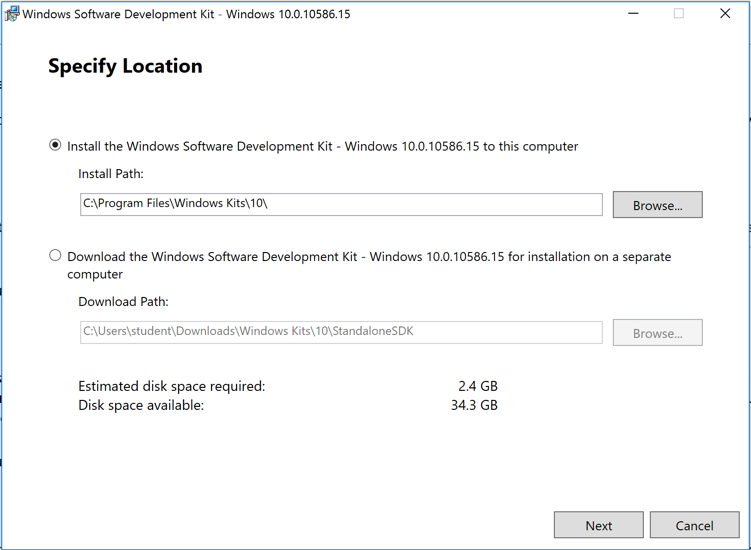At the "Windows Kits Privacy" screen, accept the default options and click Next.