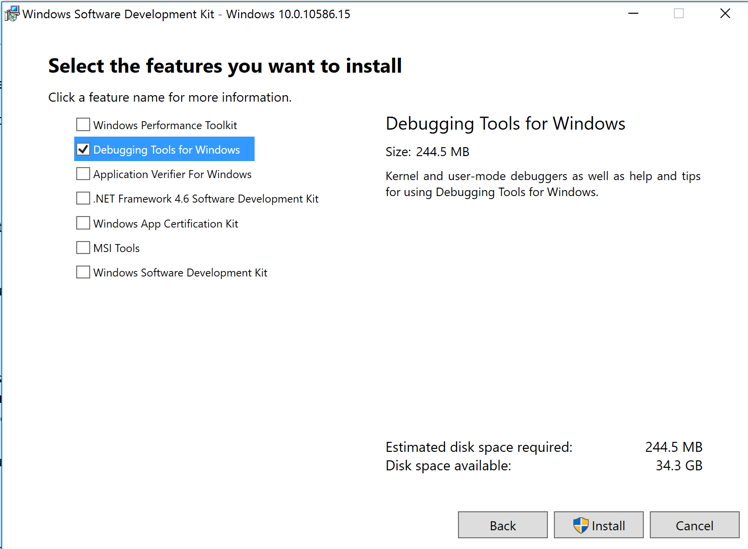 At the "Select the features you want to install" screen, check the "Debugging Tools for Windows" box and clear all the other boxes, as shown below: