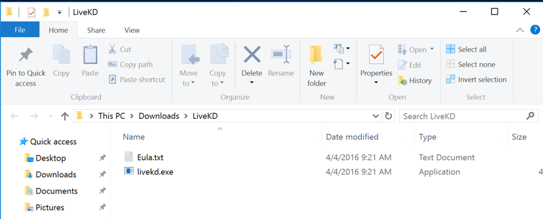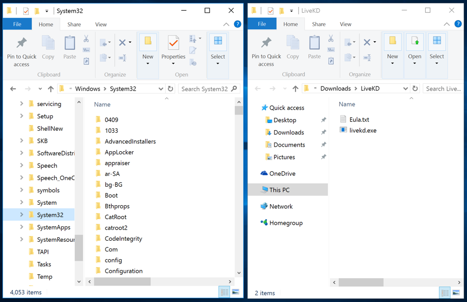 Drag livekd.exe onto the System32 folder in the left pane of the other File Explorer window