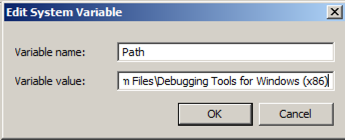 At the end of the Path, append a semicolon followed by the path to Windbg, which will be similar to this: