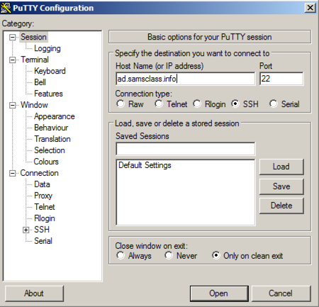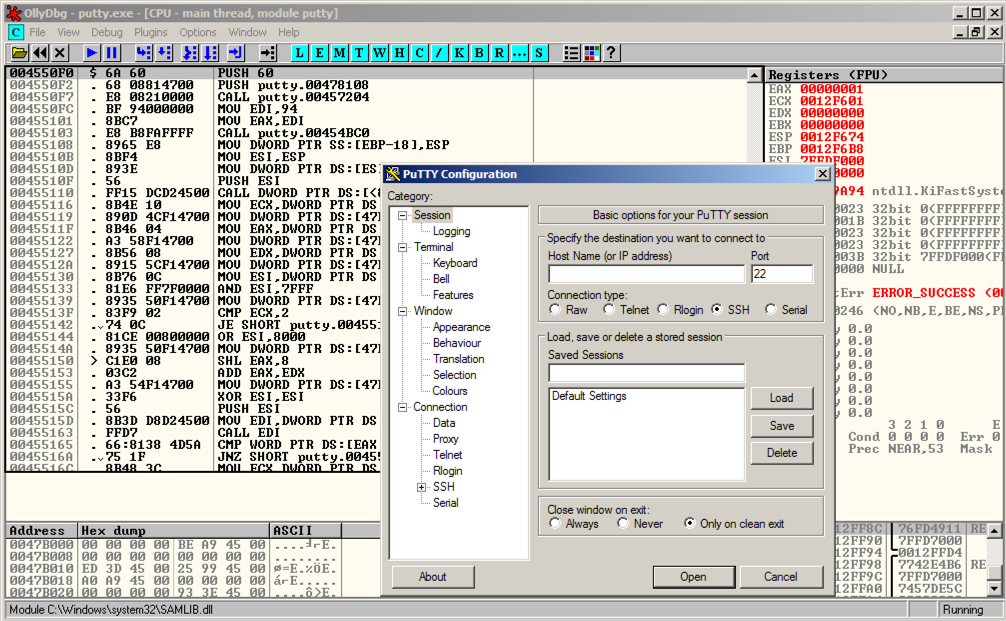 A Putty window opens, but it's behind the Olly window.一个腻子窗口打开,但它在Olly窗口后面。 At the bottom of the screen, in the taskbar, click the " PuTTY Configuration " button to bring the PuTTY window to the front, as shown below.在屏幕底部的任务栏中,单击“ PuTTY Configuration ”按钮,将PuTTY窗口置于前面,如下所示。