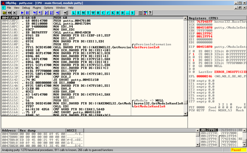 In Ollydbg, from the menu bar, click File , Open .在Ollydbg中,从菜单栏中单击文件 , 打开 。 Navigate to putty.exe and open it.导航到putty.exe并打开它。