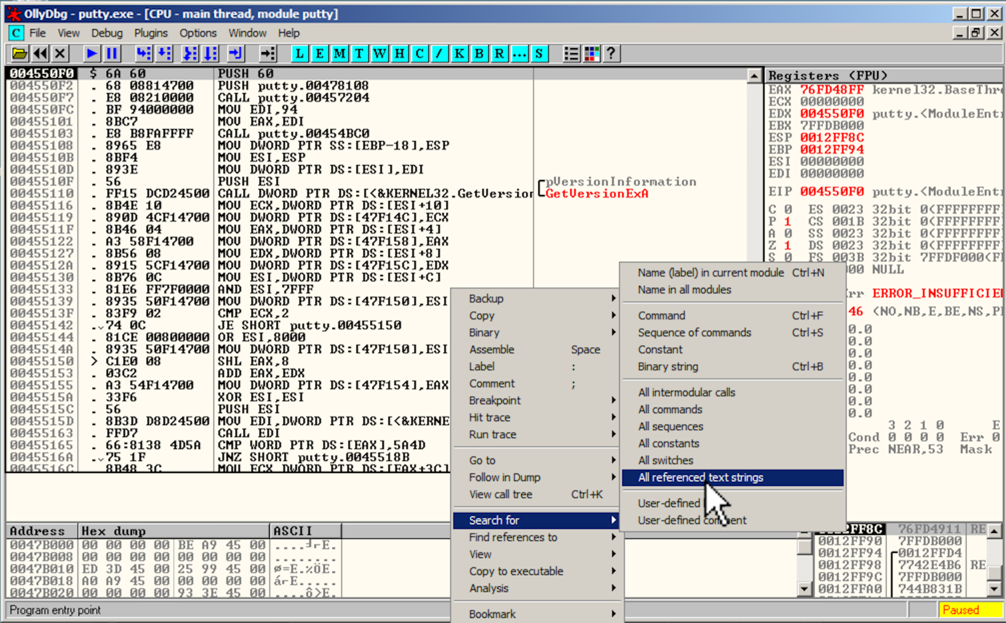 In Ollydbg, in the "Assembly Code" pane, right-click.在Ollydbg中的“汇编代码”窗格中,右键单击。 Point to " Search for ".指向“ 搜索 ”。 Click " All referenced text strings ", as shown below.点击“ 所有引用的文本字符串 ”,如下所示。