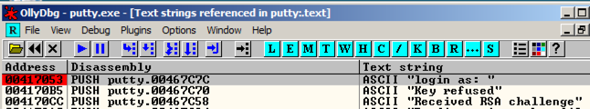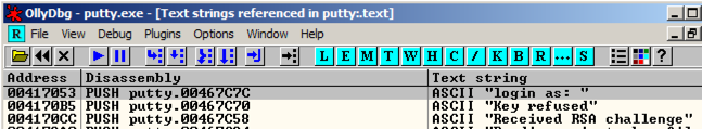 A "Text strings referenced in putty:.text" window opens, showing all the strings in the program.将打开“在putty:.text中引用的文本字符串”窗口,显示程序中的所有字符串。