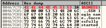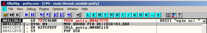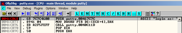 This shows the command at this location.这显示在这个位置的命令。 It's a PUSH instruction, placing the address 467C7C onto the stack.这是一个PUSH指令,将地址467C7C放入堆栈。 That address points to the letter "l" in the ASCII string "login as: ", as shown on the right side of the instruction line, outlined in green in the image below.该地址指向ASCII字符串“login as:”中的字母“l”,如指令行右侧所示,在下图中以绿色标出。