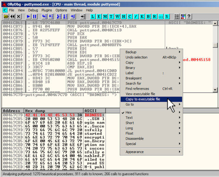 In Ollydbg, in the top left pane of the CPU window, right-click, point to " Copy to Executable ", and click " All modifications ", as shown below.在Ollydbg中,在CPU窗口的左上方窗格中,右键单击,指向“ 复制到可执行文件 ”,然后单击“ 所有修改 ”,如下所示。