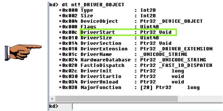 This shows the first few lines of a driver object structure, which stores information about a kernel driver, as shown below. Notice the DriverStart pointer--this contains the location of the driver in memory.