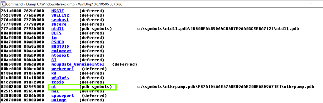 Scroll down to find the module named nt, as shown below. It's easy to spot because it'e one of the few modules that shows a Symbols path.