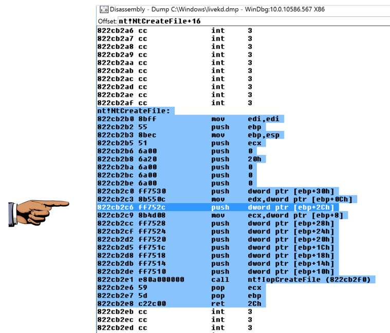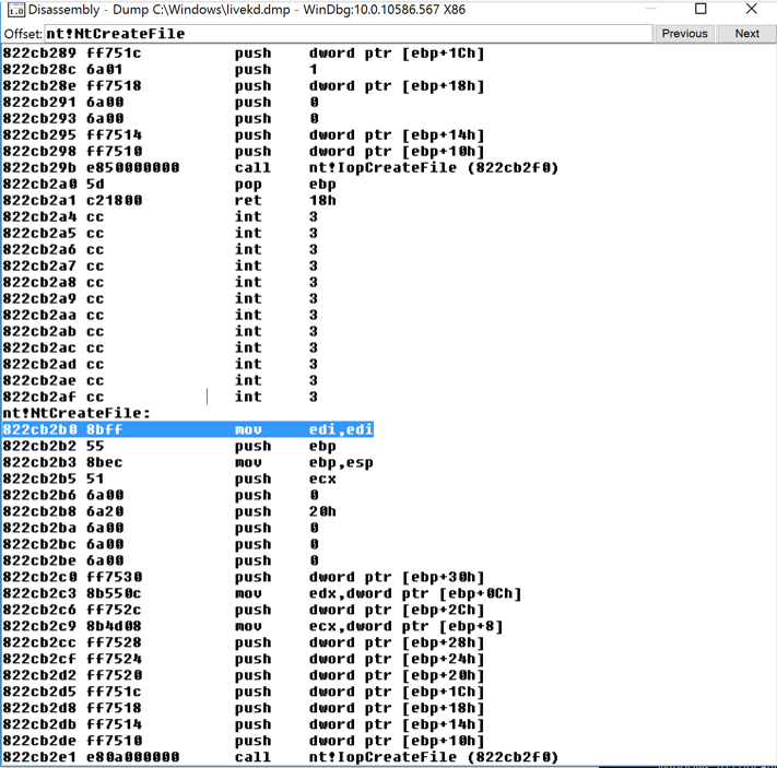This shows the assembly code before and after the start of the NtCreateFile function, as shown below: