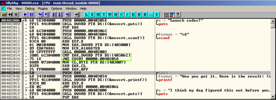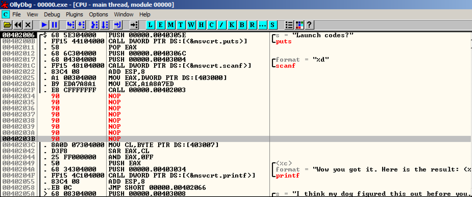 prints out "Launch codes?", reads in a decimal number (%d), and then