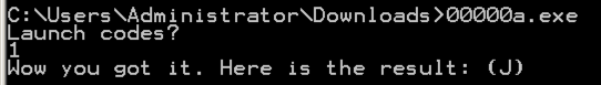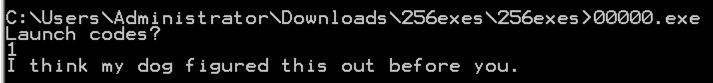 Run 00000.exe in a Command Prompt.在命令提示符下运行00000.exe 。 It asks for a "Launch code" and if you guess wrong, it insults you, as shown below.它要求提供“启动代码”,如果您猜错了,它会侮辱您,如下所示。