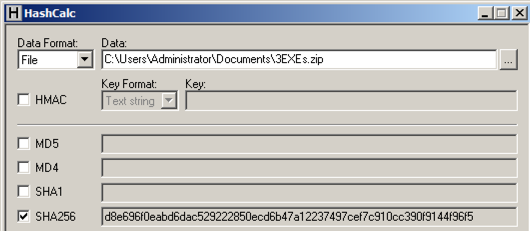 In the Documents folder of the VM handed out by your instructor, find the 3EXEs.zip file.在教师发布的VM的Documents文件夹中,找到3EXEs.zip文件。 Checking the Hash检查哈希