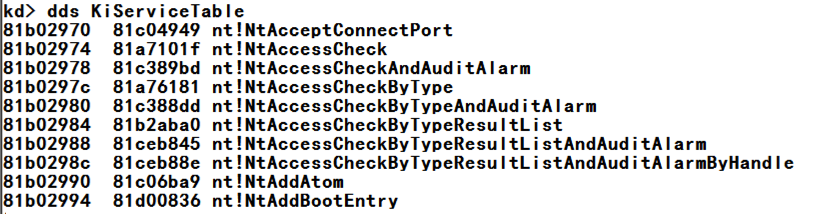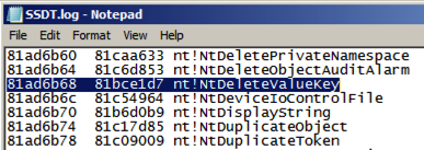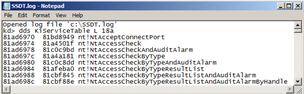 In Windows Explorer, navigate to the C:\SSDT.log file and open it.在Windows资源管理器中,导航到C:\ SSDT.log文件并将其打开。 It should contain all the SSDT pointers, as shown below.它应该包含所有的SSDT指针,如下所示。.logopen c:\SSDT.log .logopen c:\ SSDT.log dds KiServiceTable L 18a dds KiServiceTable L 18a .logclose .logclose