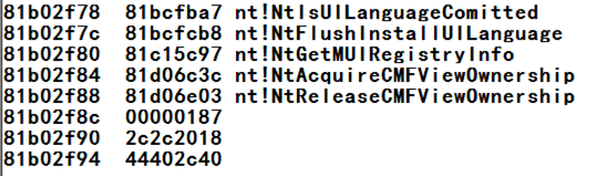 You see the start of the SSDT, as shown below.您会看到SSDT的开始,如下所示。 There are pointers here for many kernel routines.这里有很多内核例程的指针。 Execute this command to display the first 18a (hexadecimal) pointers in the SSDT:执行此命令以显示SSDT中的第一个18a(十六进制)指针: