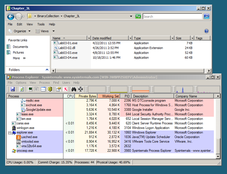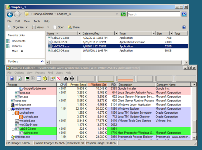 After a second or two, the Lab03-03.exe process terminates, leaving the svchost.exe running as an orphan process, as shown below.一两秒钟后,Lab03-03.exe进程终止,将svchost.exe作为孤立进程运行,如下所示。