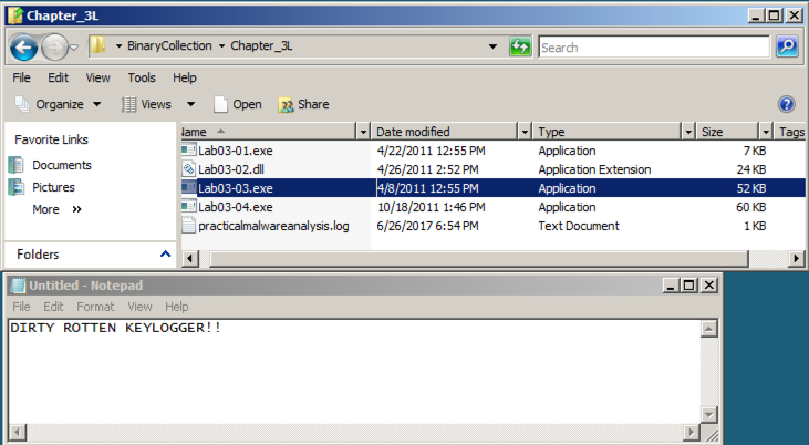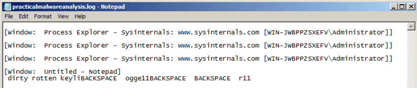 Double-click the practicalmalwareanalysis.log file.双击实用的malwareanalysis.log文件。 The stolen keystrokes appear, as shown below.出现被盗的按键,如下所示。