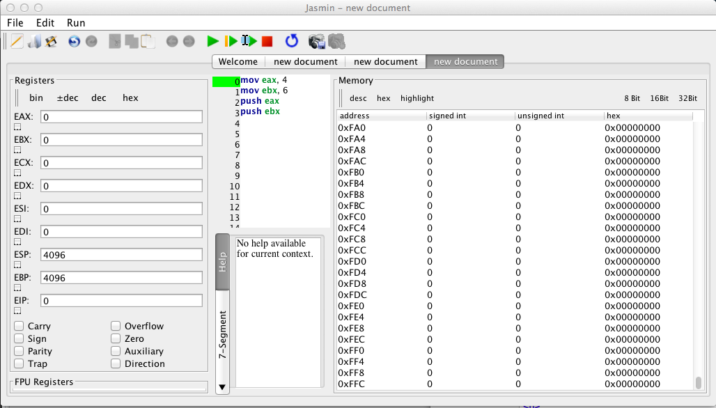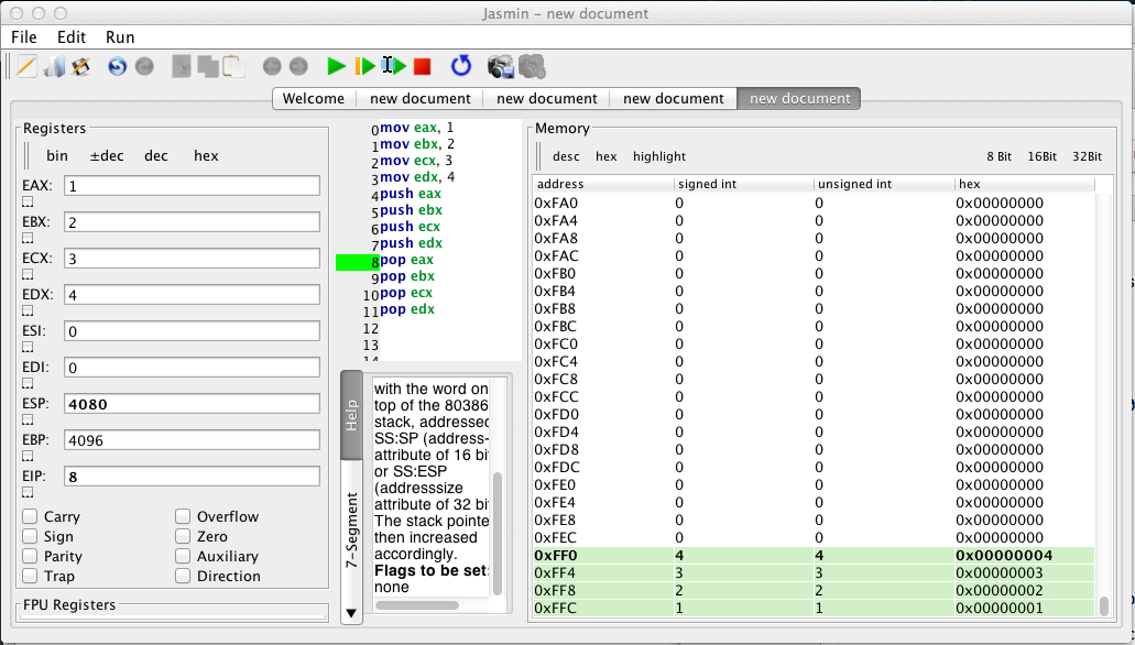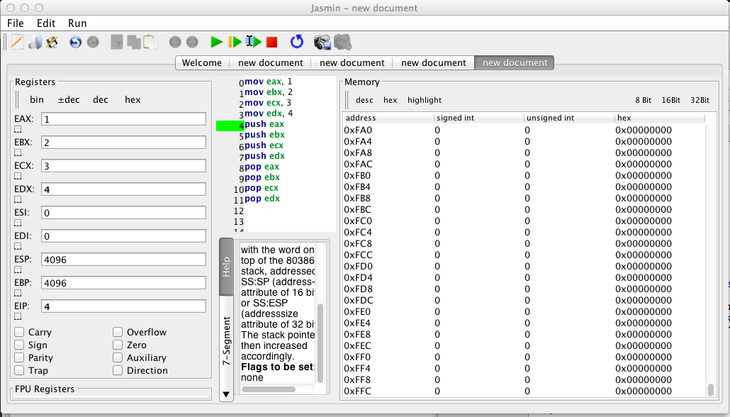 Push the Step four times to execute only the first four instructions, as shown below:按下这个步骤四次只执行前四条指令,如下所示: